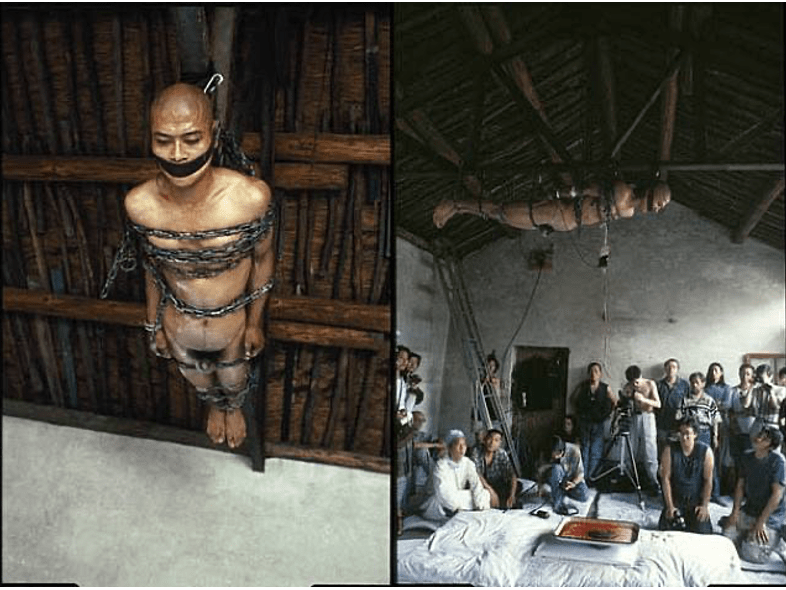 The grotesque nature of 65kg is evident in the extreme physical conditions Zhang subjected himself to. The naked and suspended body, contorted and visibly strained, evokes a strong sense of discomfort and unease. This feeling is enhanced further when the viewers walk into the space to smell his blood and sweat burning in the pan below.[1] This deliberate use of grotesque imagery serves to push the boundaries of what is traditionally considered acceptable in art, forcing viewers to confront raw voluntary human suffering. While Zhang himself states that he cannot stop political interpretations of his works, he argues that there are no political motivations behind them.[2] However, it can be argued that Zhang’s self-imposed suffering becomes a powerful metaphor for the broader societal and personal struggles faced by individuals in times of great change and uncertainty. This is reinforced by the fact that he said that his upbring in the poor province of Henan where he was constantly surrounding by death by disease and death by abortion resulted in his turn against classical art to more performative and experimental art, therefore 65kg can be interpreted as a critique of the oppressive socio-political environment in China during the early 1990s.[3] The bound, naked body symbolises the lack of freedom and autonomy experienced by many under an authoritarian regime and the legacy of the Cultural Revolution. Zhang states that the performance delves into existential questions about human existence, pain, and endurance. By pushing his body to its limits, he prompts viewers to consider the nature of suffering and the human condition. The grotesque elements of the performance underscore the harsh realities of life and the inescapable aspects of physical and emotional pain. We can see a rationalisation of this grotesque as it serves to disrupt conventional aesthetic norms and catalyse contemplation of the harsh realities that Zhang was experiencing. The raw and unfiltered presentation of suffering and endurance challenges the viewer to confront uncomfortable truths about why artists such as Zhang feel compelled to put their body through this sort of human experience which is such a stark difference from traditional Chinese art.