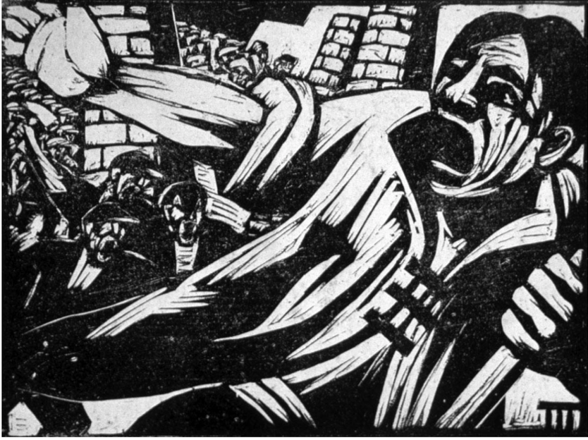 Hu Yichuan, To the Front!, woodcut, 1932, 9 1/8 X 12.” Lu Xun Memorial, Shanghai.x