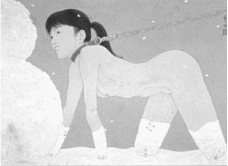 It is also interesting to examine Gennifer Weisenfeld’s essay “Reinscribing Tradition in a Transnational Art World” from Asian Art History in the Twenty-First Century as it explores how contemporary Asian artists, including those from Japan, navigate the global art scene by drawing on traditional elements.[3] Weisenfeld argues that these artists do not merely reference tradition nostalgia but transform it in innovative ways that speak to both Japanese and global audiences. Artists incorporate traditional motifs, techniques, and themes within contemporary art practices, creating a bridge between the past and present. This process of reinscribing tradition allows artists to assert their cultural identity within a transnational context, highlighting the fluidity and adaptability of cultural heritage in contemporary art. This approach reflects a broader trend in Japanese art where popular culture, with its roots in traditional practices, is continuously reinterpreted and transformed. We see this similar approach in Makoto Aida’s Dog (Snow), 1998, figure 1.[4] Here he has used traditional Japanese style to paint deliberately confrontational subjects of a nubile nude crawling along with a leash around her neck. Nicholas Bornoff in the essay “Sex and Consumerism: the Japanese State of the Arts” in Consuming Bodies: Sex and Contemporary Japanese Art posits that “what makes the picture stand out is not just that she is pretty and overtly sexy, nor even that she looks a tad under the age of consent – which is not unusual in Japan. What really hits home is that she happens to be an amputee and advances daintily forth on the bandaged stumps at her knees and wrists. Perfectly outrageous; perfectly in tune with the times. This stuff is confrontational and sexy, and it sells”.[5]
