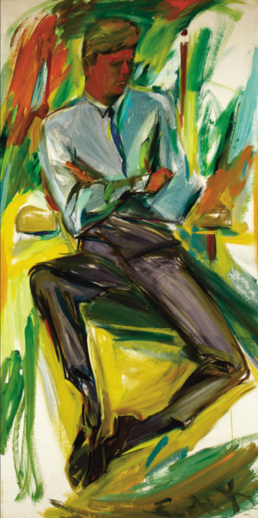 While it could be argued that this piece has some connotations of control and authoritative power, I can’t help but disagree to a certain extent. I think my disagreement comes from the extra reading and research I have done. While looking at the piece, the crossed arms and stern and straight face resembles a closed off nature. This is contradicted by the spread, relaxed legs, and coloured background which I think resembles youthfulness, and calmness. Moreover, the fact that Kennedy let Elaine de Kooning sit in on his personal time, conferences, and briefings, generates this image of trust and humility from Kennedy. Moreover, Kennedy’s daughter would paint alongside de Kooning which further exhibits this safe and relaxed atmosphere which also translates into this piece, rather than a complete authoritative nature. Therefore, while this abundance of power is undeniable it would be wrong to suggest that this piece only depicts this, because of the relaxed atmosphere and bright colours that de Kooning exhibits.